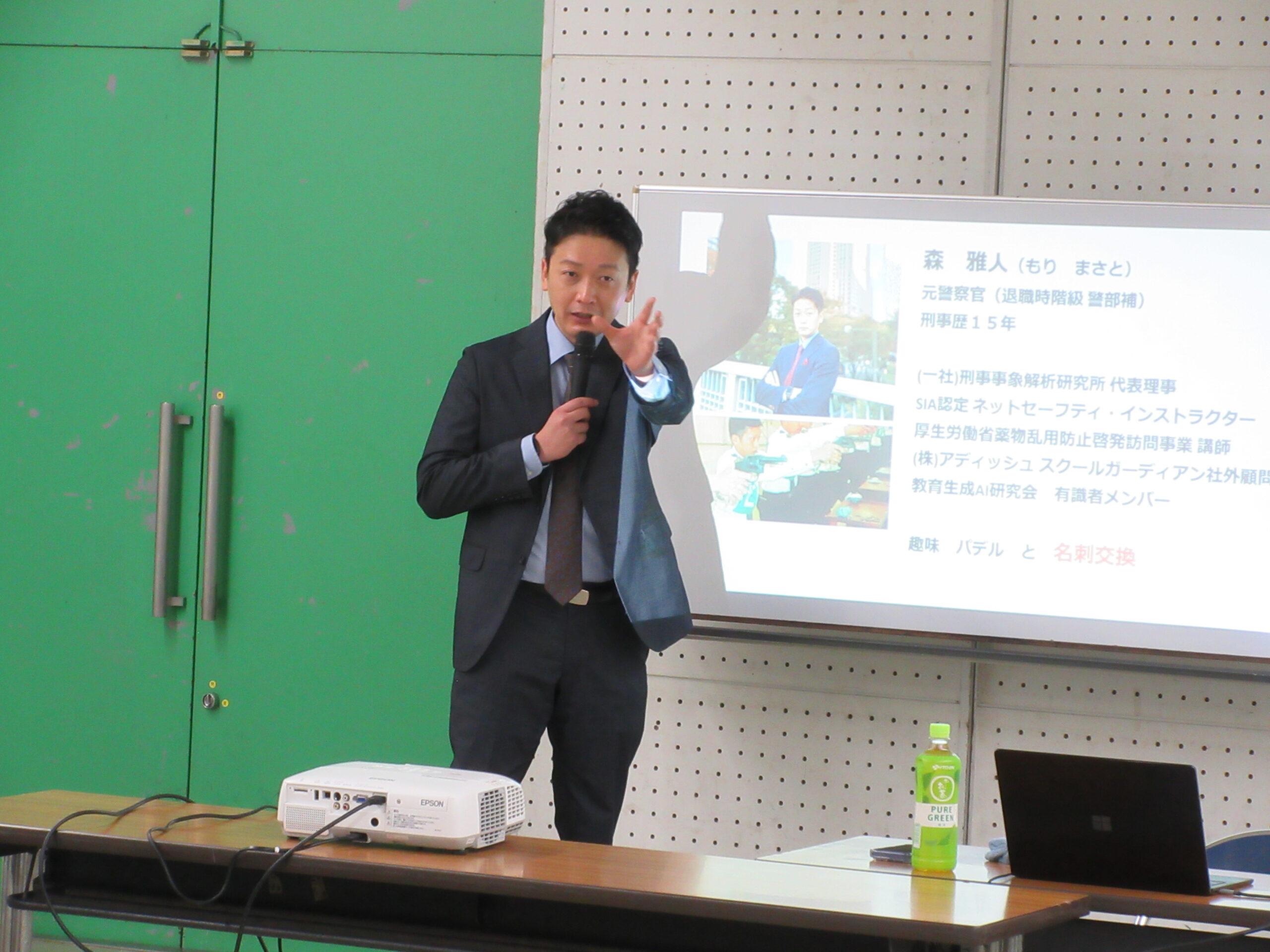 一般社団法人刑事事象解析研究所 代表理事 森雅人氏を講師に、SNS利用時の犯罪に巻き込まれないための注意点等を、元警部補の視点からご説明いただきました。